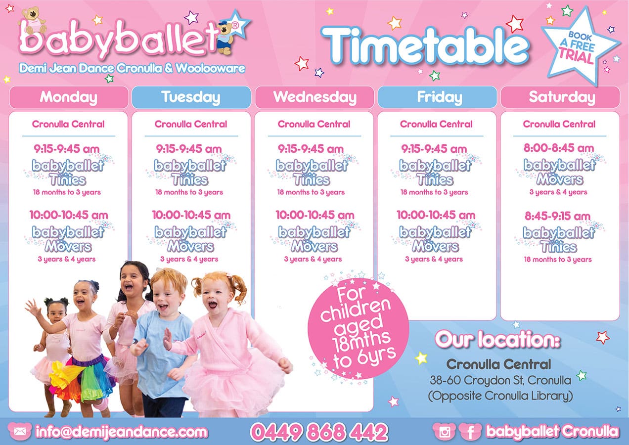 We run babyballet® dance classes for Tinies and Movers, and Groovers. Find below our babyballet® timetable where you can find a day and time that best suits you. Demi Jean Dance is delighted to be the first dance school in the Sylvania area to bring the magic of babyballet® dance classes to you. Our babyballet® program offers four stages of dance classes for your 18 month to 6 year old! The perfect way to start your child’s dance journey!